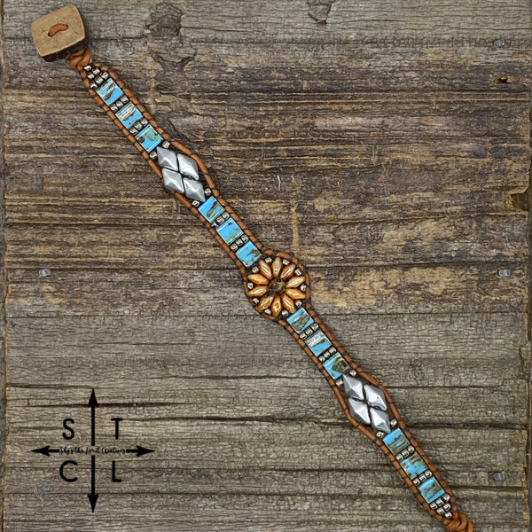 Our Daisy bracelet is a charming boho-style Sky the Limit original, crafted especially for you. The bracelet is handcrafted using a laddered design done on red brown leather cording adorned with apricot, Picasso turquoise, matte silver and gunmetal beads. The Daisy bracelet measures 7.25 to 8.25 inches in length and is secured with an adorable button closure.