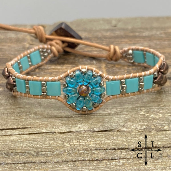 Our Daisy bracelet is a charming boho-style Sky the Limit original, crafted especially for you. The bracelet is handcrafted using a laddered design done on natural leather cording adorned with clear turquoise, light turquoise, metallic brown and gun metal silver beads. The Daisy bracelet measures 7.25 to 8.25 inches in length and is secured with an adorable button closure.