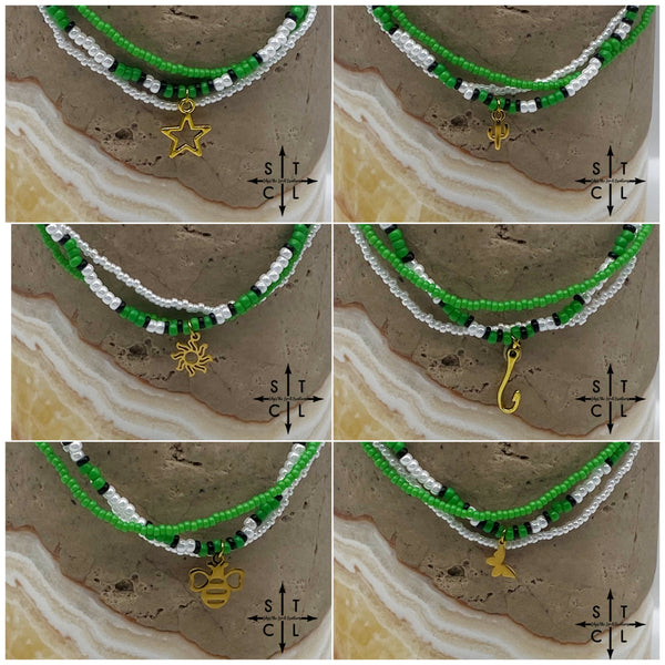 3 hand beaded stretchy anklets sign me! No clasp just slip them on and you are ready to go! Wear all three or just one, the choose is yours. Grab a couple at this price you cannot go wrong! One of the anklets has a charm and the bead colors in all three ankles are Green, pearl white, and black. Pick from gold plated stainless steel star fish, flower, fish mermaid tail, lotus flower, butterfly, bee, hook, sun, cactus, star and dragon fly