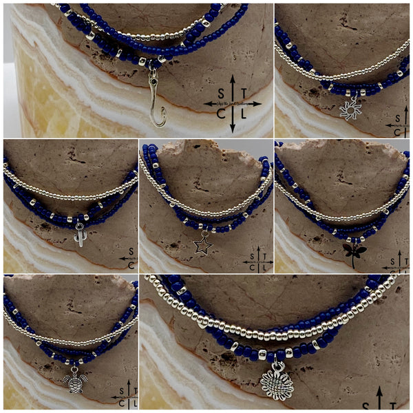3 hand beaded stretchy anklets sign me! No clasp just slip them on and you are ready to go! Wear all three or just one, the choose is yours. Grab a couple at this price you cannot go wrong! One of the anklets has a charm and the bead colors in all three ankles are pearl navy blue and gold. Pick from stainless steel star fish, flower, fish mermaid tail, lotus flower, butterfly, bee, hook, sun, cactus, star and dragon fly