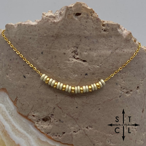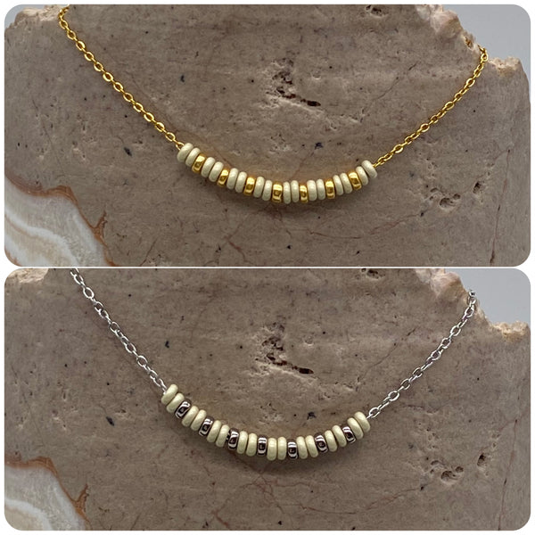 This necklace measures 16.5 inches and includes a 2-inch extender chain, giving it a total length of 18.5 inches. The chain is stainless steel or gold plated stainless steel, featuring beads in pearl off white gold or silver.