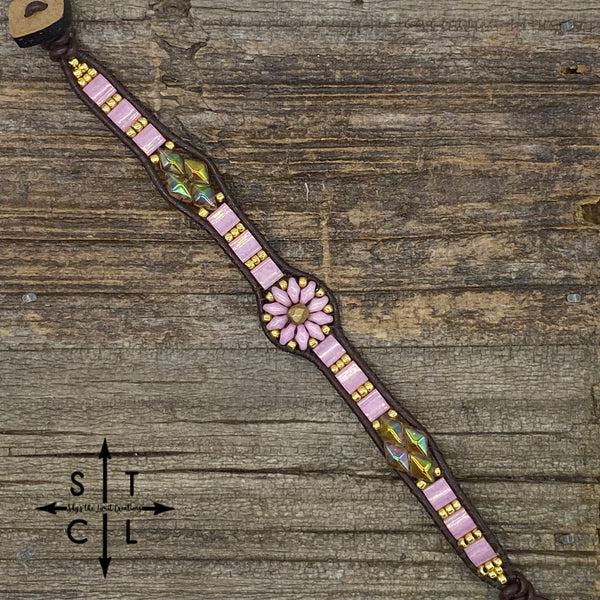 Our Daisy bracelet is a charming boho-style Sky the Limit original, crafted especially for you. The bracelet is handcrafted using a laddered design done on brown leather cording adorned with pink, peacock gold and gold beads. The Daisy bracelet measures 7.25 to 8.25 inches in length and is secured with an adorable button closure.