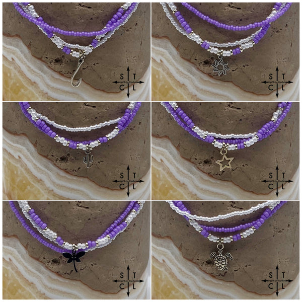 3 hand beaded stretchy anklets sign me! No clasp just slip them on and you are ready to go! Wear all three or just one, the choose is yours. Grab a couple at this price you cannot go wrong! One of the anklets has a charm and the bead colors in all three ankles are purple, white and silver. Pick from stainless steel star fish, flower, fish mermaid tail, lotus flower, butterfly, bee, hook, sun, cactus, star and dragon fly