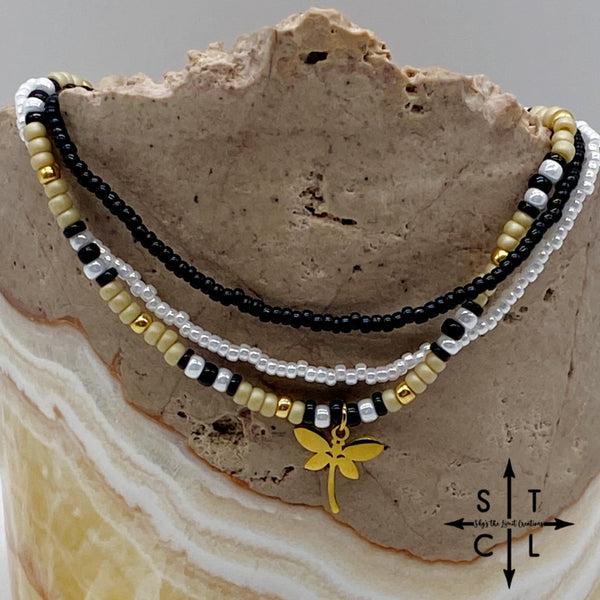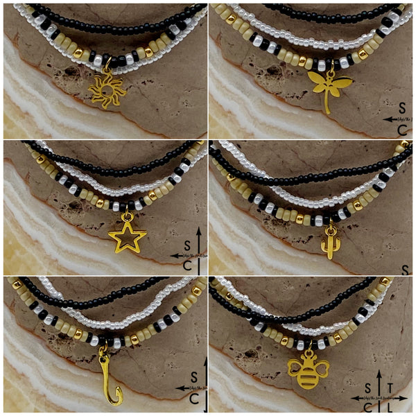 3 hand beaded stretchy anklets sign me! No clasp just slip them on and you are ready to go! Wear all three or just one, the choose is yours. Grab a couple at this price you cannot go wrong! One of the anklets has a charm and the bead colors in all three ankles are tan, pearl white, black, and gold. Pick from gold plated stainless steel star fish, flower, fish mermaid tail, lotus flower, butterfly, bee, hook, sun, cactus, star and dragon fly