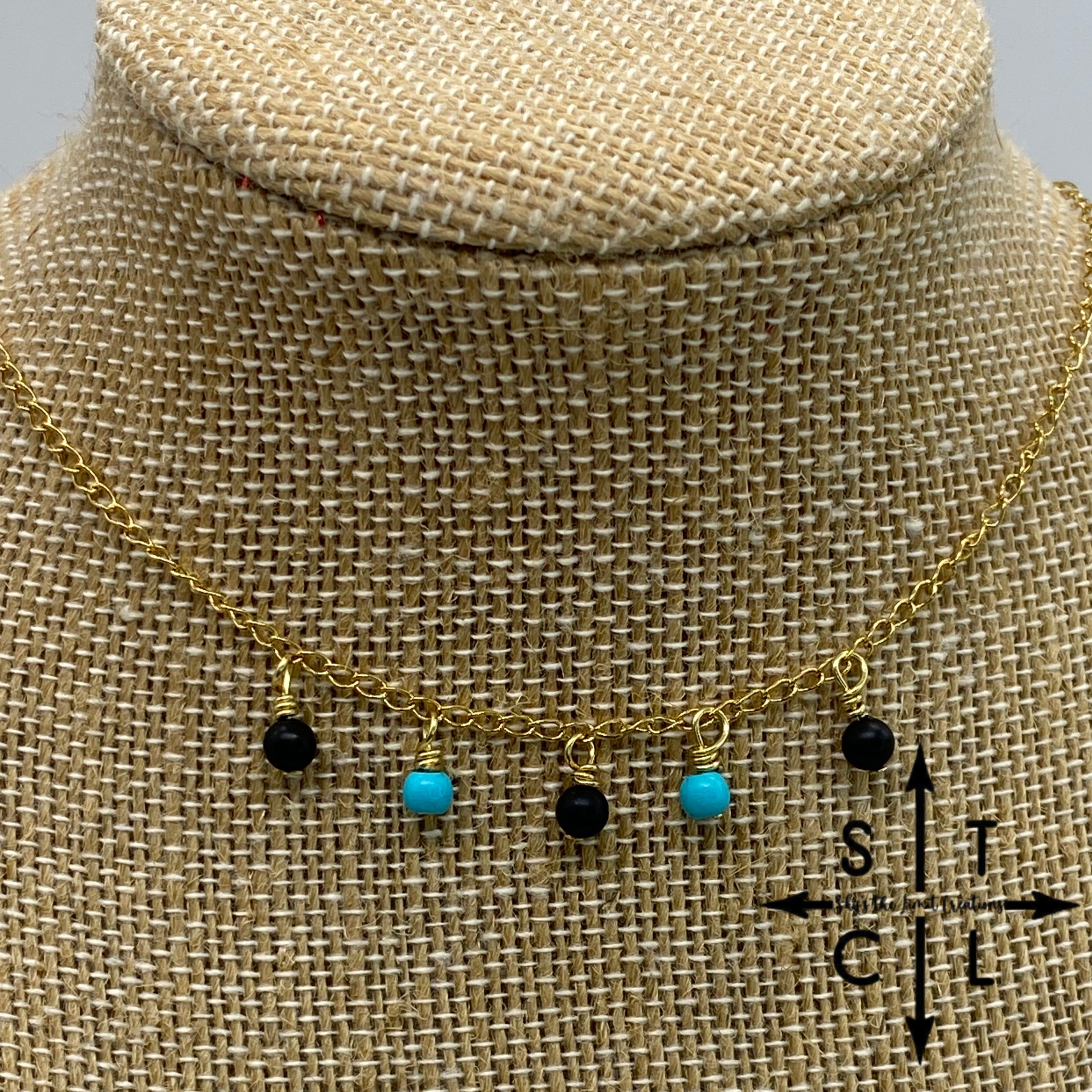 Our Katy necklace will add a pop of fun to any outfit! Her Turquoise howlite and black beads are wrapped onto a 2 mm gold stainless steel chain. The Katy necklace is another must have Sky’s the Limit original. She is super lightweight 16.5 in long, comes with a 2 in extender chain, and has a lobster clasp closer.
