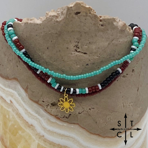 3 hand beaded stretchy anklets sign me! No clasp just slip them on and you are ready to go! Wear all three or just one, the choose is yours. Grab a couple at this price you cannot go wrong! One of the anklets has a charm and the bead colors in all three ankles are turquoise, maroon, black and white. Pick from gold plated stainless steel star fish, flower, fish mermaid tail, lotus flower, butterfly, bee, hook, sun, cactus, star and dragon fly