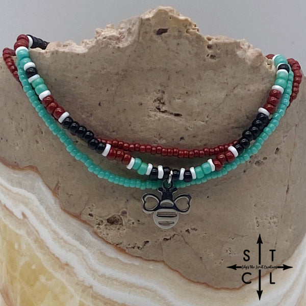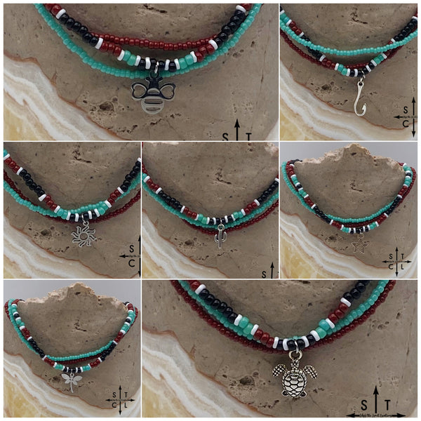 3 hand beaded stretchy anklets sign me! No clasp just slip them on and you are ready to go! Wear all three or just one, the choose is yours. Grab a couple at this price you cannot go wrong! One of the anklets has a charm and the bead colors in all three ankles are turquoise, maroon, black and white. Pick from stainless steel star fish, flower, fish mermaid tail, lotus flower, butterfly, bee, hook, sun, cactus, star and dragon fly