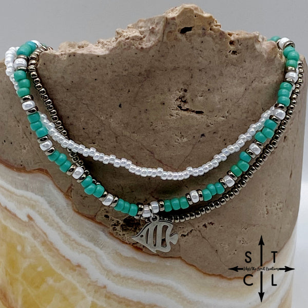 3 hand beaded stretchy anklets sign me! No clasp just slip them on and you are ready to go! Wear all three or just one, the choose is yours. Grab a couple at this price you cannot go wrong! One of the anklets has a charm and the bead colors in all three ankles are turquoise, white and gun metal silver. Pick from stainless steel star fish, flower, fish mermaid tail, lotus flower, butterfly, bee, hook, sun, cactus, star and dragon fly