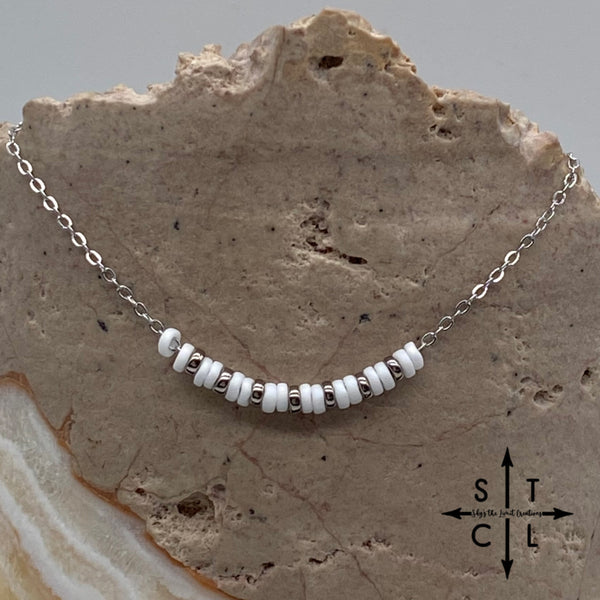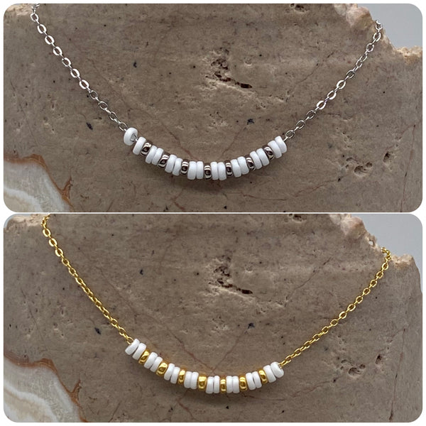 This necklace measures 16.5 inches and includes a 2-inch extender chain, giving it a total length of 18.5 inches. The chain is stainless steel or gold plated stainless steel, featuring beads in white gold or silver.