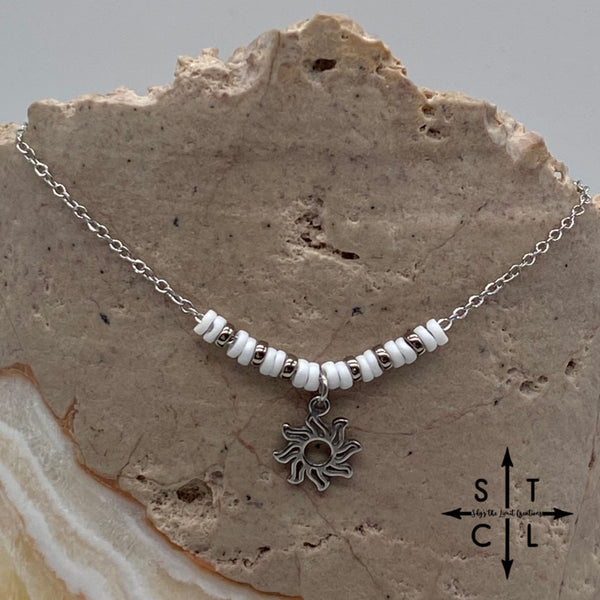This necklace measures 16.5 inches and includes a 2-inch extender chain, giving it a total length of 18.5 inches. The chain is stainless steel or gold plated stainless steel, featuring beads in white gold or silver, along with a sun charm.